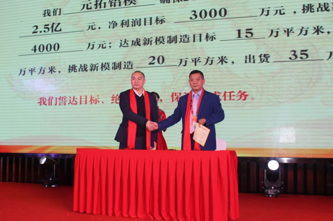 現(xiàn)場(chǎng),元拓建材集團(tuán)董事長(zhǎng)游炎明與三大業(yè)務(wù)板塊領(lǐng)頭人簽訂了2019年度經(jīng)營(yíng)目標(biāo)挑戰(zhàn)承諾書(shū),三位領(lǐng)頭人再把任務(wù)進(jìn)行詳細(xì)分解并與下屬團(tuán)隊(duì)負(fù)責(zé)人簽署了目標(biāo)責(zé)任書(shū)。全體業(yè)務(wù)、生產(chǎn)骨干紛紛在臺(tái)上宣誓,2019年將全力以赴,堅(jiān)決完成挑戰(zhàn)目標(biāo)。